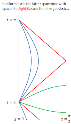 In section 8.1 we meet maximally symmetric universes. That's universes where every point in spacetime is the same. I think the only ones are de Sitter, Minkowski and Anti de Sitter. We've done flat, boring Minkowski. De Sitter and Anti de Sitter are more interesting and we do conformal diagrams for both of them. At the end of the section Carroll does conformal anti de Sitter and casually draws some geodesics on it without saying how he plotted them. I was able to put my newly learnt skills to good use and show the same curves as he did😀. My version is on the left.